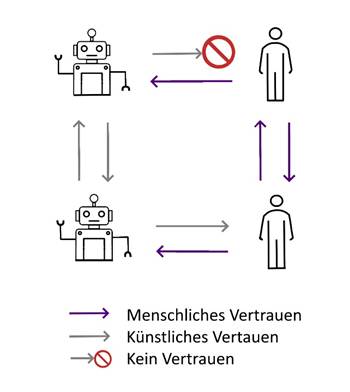 Anders sieht das im Forschungskontext Mensch-KI-Teams aus. KI-Agenten, die mit Menschen kooperieren, bedürfen des „Vertrauens“ der menschlichen Teammitglieder. Reziprok muss aber auch die KI dem Menschen „trauen“ sowie anderen KI-Teammitgliedern. Beim sogenannten „künstlichen Vertrauen“ können nämlich sowohl der Vertrauende (engl. „trustor“) sowie der Gegenstand des Vertrauens (engl. „trustee“) nicht menschlicher Natur sein. Von der technischen Implementierung hängt es also ab, wer künftig vom KI-Agenten im hybriden Team als „vertrauenswürdig“ eingestuft wird.